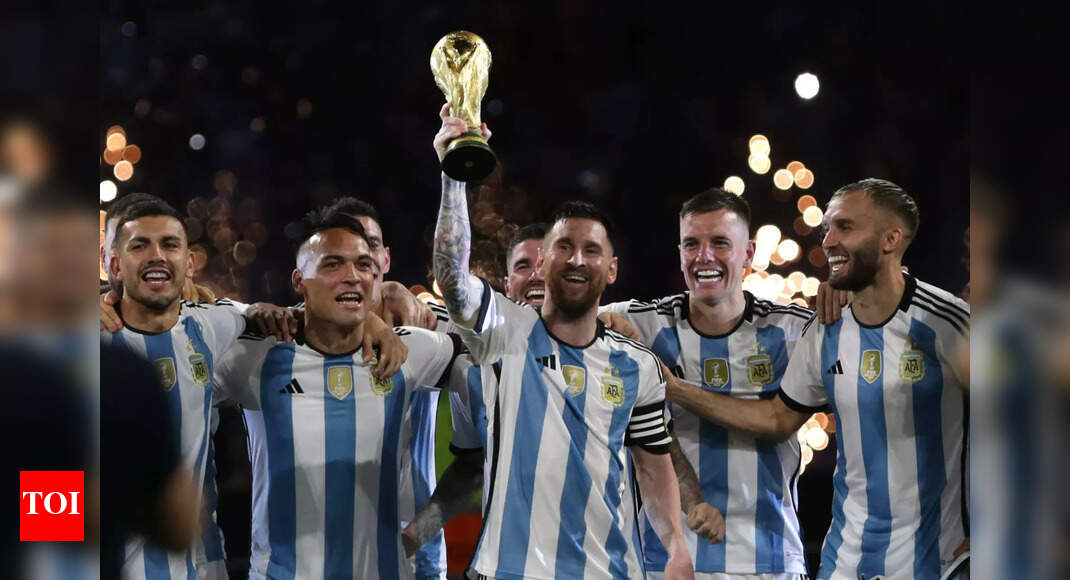 अर्जेटिनाचा लिओनेल मेस्सी आणि टीममेट्स फिफा वर्ल्ड कप ट्रॉफीसह वर्ल्ड चॅम्पियन्सच्या उत्सवाच्या वेळी साजरा करतात. अर्जेंटिनाच्या सॅन्टियागो डेल एस्टेरो येथे 28 मार्च 2023 रोजी एस्टॅडिओ